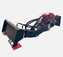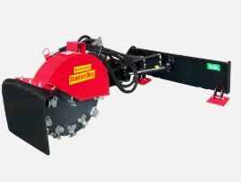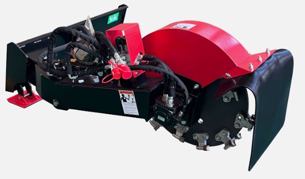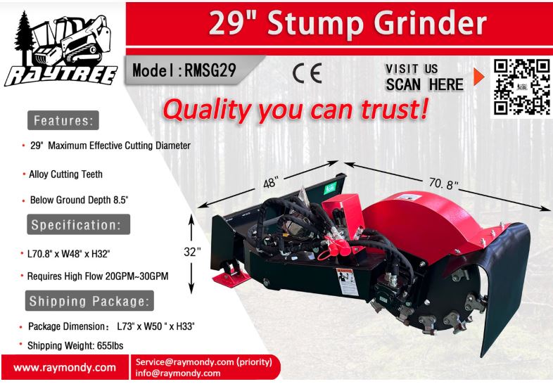he Raytree RMSG29 is a 29-inch articulating, quick-attach stump grinder designed for skid steers and featuring a 26-tooth cutting wheel, 8.5-inch below-ground depth, and requiring 20–30 GPM high-flow hydraulics.